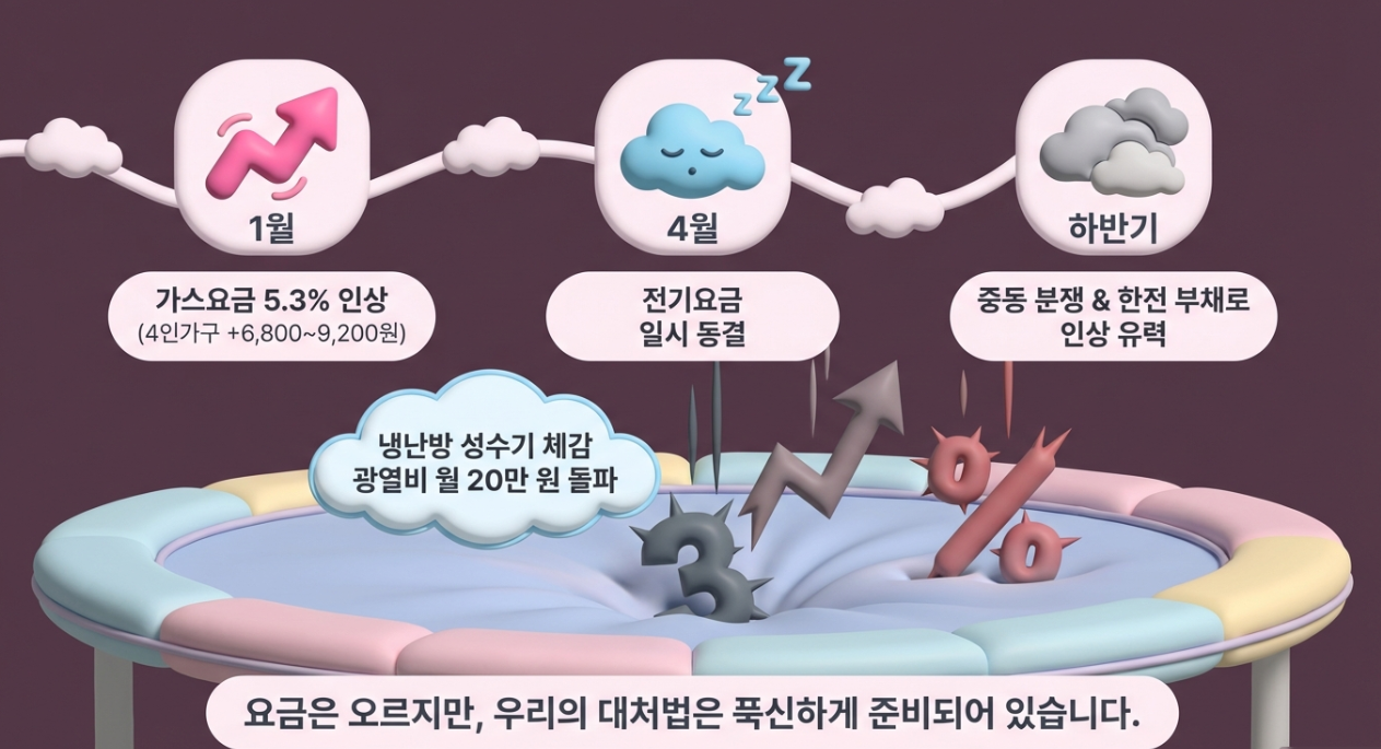 [2026 경제 상황 리포트] 2026년 1월부터 도시가스 요금이 전년 대비 약 5.3% 인상되면서 4인 가구 기준 최대 9,200원가량의 추가 부담이 발생했습니다. 2분기 전기요금은 다행히 동결되었으나, 중동 분쟁과 한전 부채 문제로 인해 3분기 하반기부터는 인상이 유력한 상황입니다. 이제는 '에너지 다이어트'가 선택이 아닌 필수가 된 시대, 우리 집 가계부를 지키는 구체적인 방법을 정리해 드립니다.