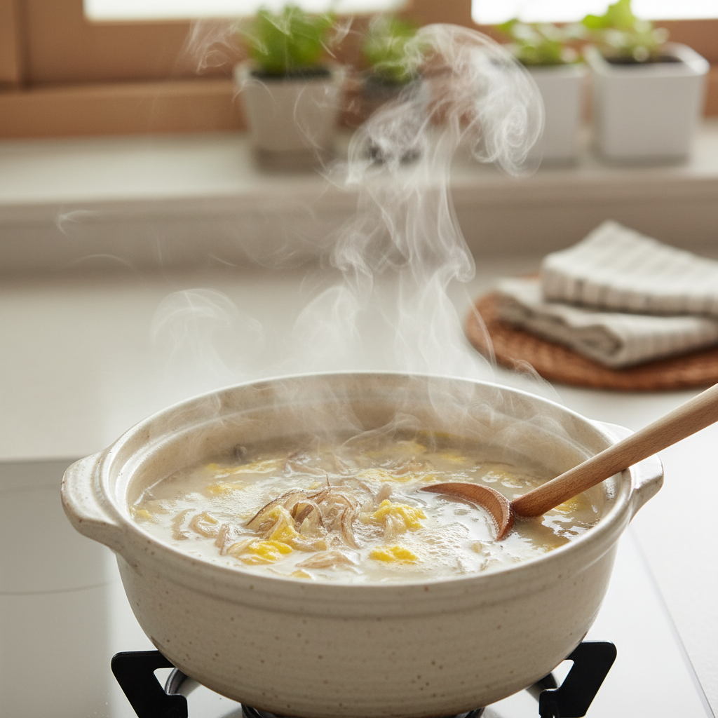 - 마무리: 국물이 뽀얗게 우러나면 계란 노른자 한 개를 풀어 넣고 한소끔 더 끓입니다.