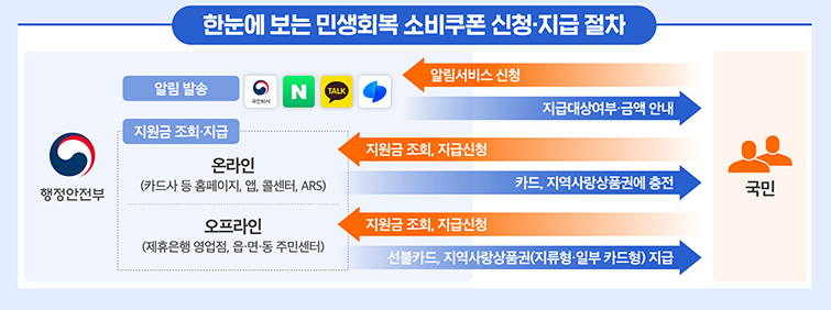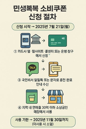 [ 신청 시작 7월21일 ] ↓ ① 카드사 앱/웹/콜센터 또는 은행창구 접수 ↓ ② 신청 완료 후 다음날 카드 자동 충전 ↓ ③ 국민비서 알림톡/문자 수신으로 확인 ↓ ④ 지역 내 소상공인 매장에서 사용