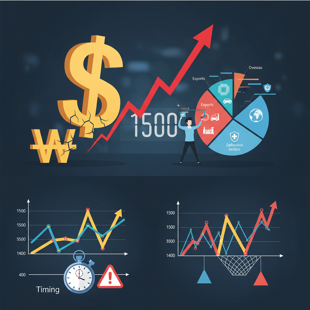 - 진입/청산 전략 ➡️:환율 1500원 돌파 직후에는 수출주 비중의 1/3을 우선 매수합니다. 1520원에 근접할 경우 추가 매수를 고려하고, 1550원대 고점 시에는 50%를 실현하여 현금화하는 유연한 접근이 필요합니다. 이후 환율이 반락하더라도 방어 섹터 비중은 유지하여 안정성을 도모합니다.