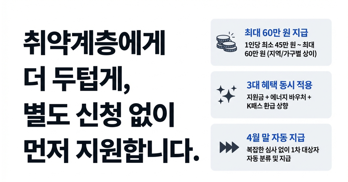 25만 원)보다 훨씬 많은 **45만60만 원**을 지원받습니다. 별도 신청 없이 자동 지급되는 것이 원칙이지만, 수령 수단(카드 포인트 vs 실물 선불카드)에 따라 확인해야 할 점이 있습니다. 상세 내용을 살펴봅니다.