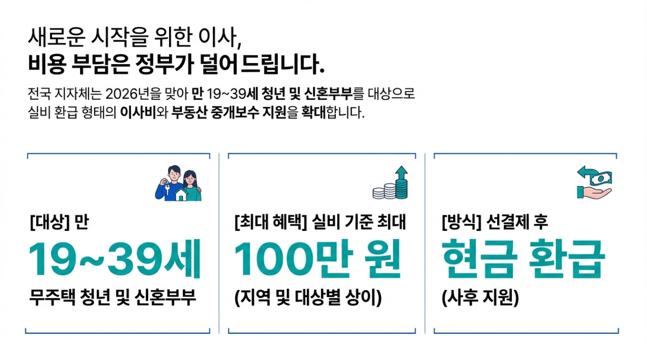 학업, 취업, 결혼으로 새로운 보금자리를 찾는 청년과 신혼부부라면 주목하세요! 지자체에서 이사비와 부동산 중개보수를 최대 50만 원까지 현금으로 환급해 드립니다. 2026년에는 행정망 연동으로 서류 제출까지 간편해졌으니, 기간 내 신청하여 주거비 부담을 덜어보시기 바랍니다.