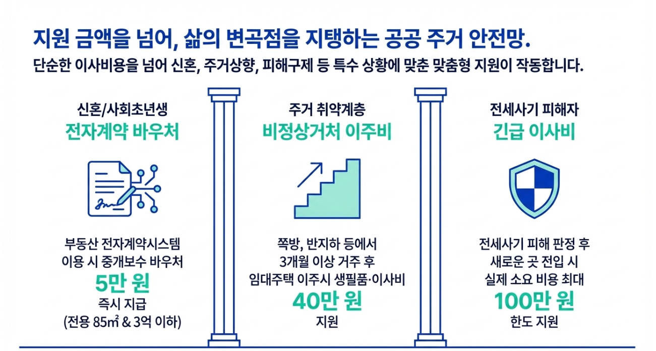 - 전세사기 피해자: 새로운 곳으로 전입 시 최대 100만 원 한도 실비 지원 (지자체별 상이).