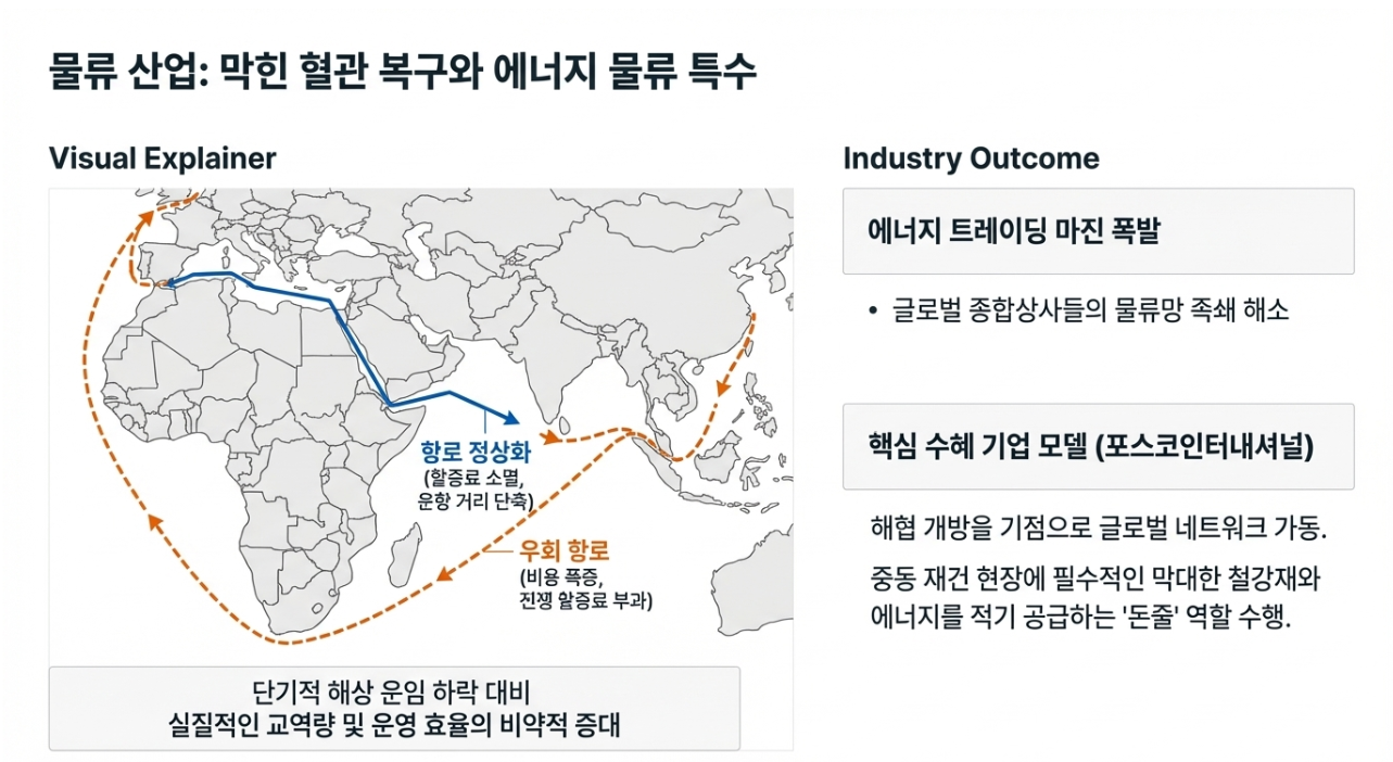 - 물류비용 완화: 희망봉 우회 항로 대신 호르무즈를 이용하게 되면서 운항 거리와 시간이 획기적으로 단축됩니다.