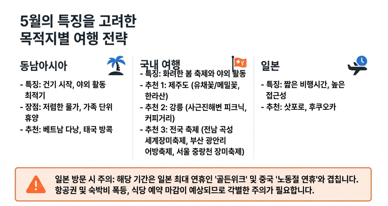 5월은 다낭, 방콕 등 동남아 주요 관광지가 건기에 해당하여 날씨가 매우 쾌적합니다. 가족 단위 휴양객에게 최고의 선택지입니다.