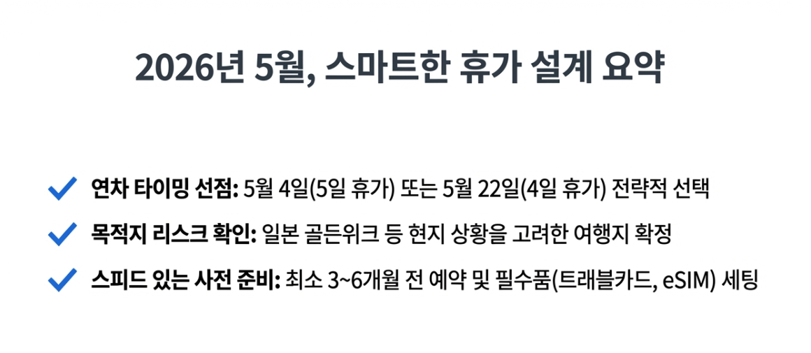 "2026년 5월은 두 번의 연휴가 있는 '축복의 달'입니다. 5월 초 황금연휴는 해외여행을, 5월 말 미니 연휴는 국내 축제 나들이를 계획해 보시는 건 어떨까요? 연차 결재는 빠를수록 좋습니다!"