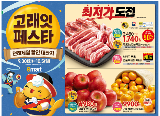추석 이후 가계 부담이 큰 시기, 삼겹살 반값·과일 초특가·생활용품 1+1으로 현명하게 장바구니를 채워보세요.