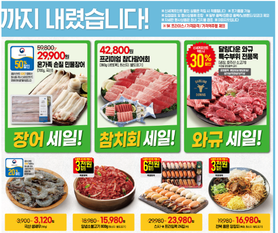 | 육류 | 삼겹살, LA갈비 | 최대 50% 할인 |