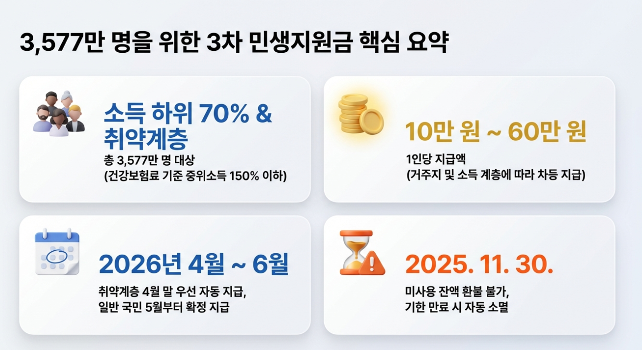 2026년 3차 민생지원금(고유가 피해지원금) 1인당 10~60만 원 지급! 소득 하위 70% 건강보험료 기준부터 맞벌이 특례, 거주 지역별 지급 금액 차이까지 '내가 받을 수 있는 금액'을 상세 가이드로 확인하세요.