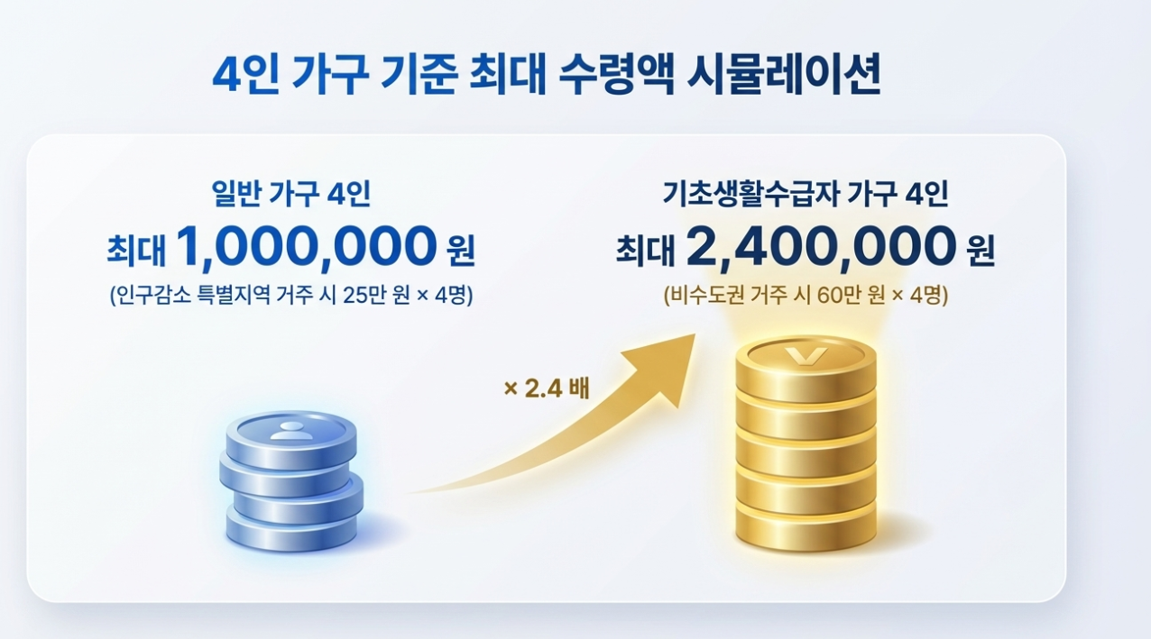 - 사례 C (인구감소 특별지역 4인 일반 가구): 1인당 25만 원 × 4명 = 총 100만 원